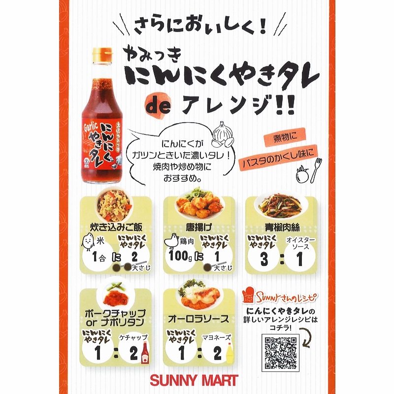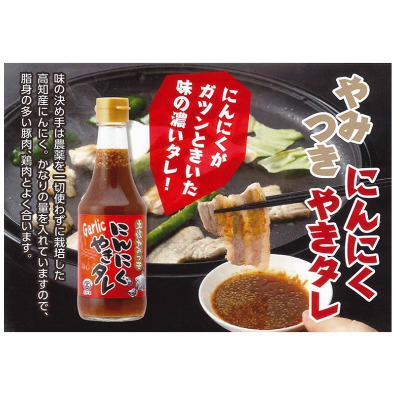 にんにくがガツンときいた味の濃いタレ!味の決め手は農薬を一切使わずに栽培した高知産にんにく!かなりの量が入っていますので脂身の多い豚肉、鶏肉とよく合います。
